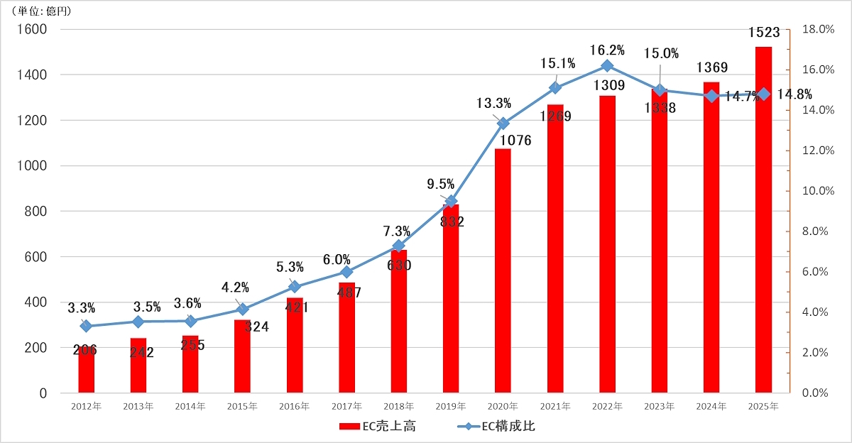 ファーストリテイリングが10月9日に発表した2025年8月期連結決算によると、国内ユニクロ事業のEC売上高は前期比11.2%増の1523億円だった。実店舗を含む国内ユニクロ事業の売上は同10.1%増の1兆260億円で、EC化率は同0.1ポイント増の14.8%となった。