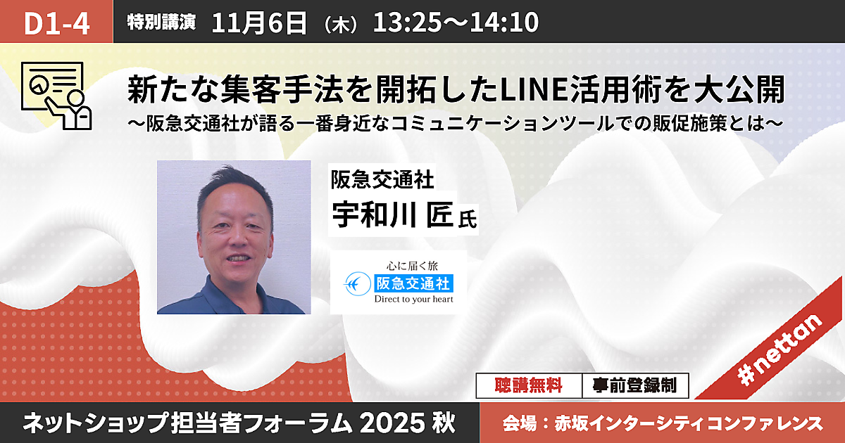 11月6日(木)+7日(金)に、大型オフラインECイベント「ネットショップ担当者フォーラム 2025 秋」を東京「赤坂インターシティコンファレンス」でリアル開催。阪急交通社、アスクル、ミスミ、タカラトミー、三越伊勢丹など大手EC・通販実施企業が登壇し、各社のノウハウや戦略などを解説します。さまざまなテーマの講演を多数用意しており、全公演すべて無料で聴講できます!(事前登録制)。まだお申し込みをしていない方のために、編集部がおすすめ講演の見どころをご紹介します。