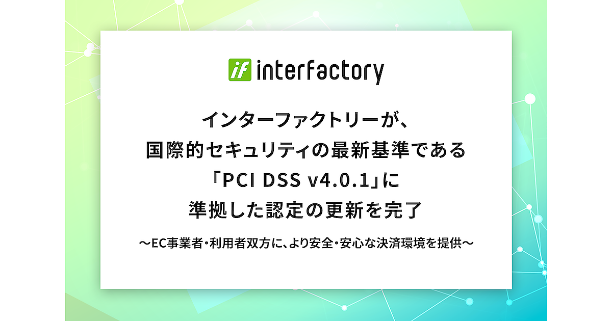 クラウドコマースプラットフォーム「EBISUMART(エビスマート)」などを展開するインターファクトリーは10月14日、クレジットカード業界の国際的なセキュリティ基準であるPCIデータセキュリティ基準(PCI DSS)の「PCI DSS v4.0.1」に準拠した認定の更新を完了したと発表した。