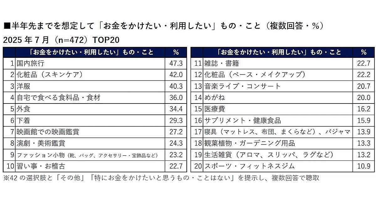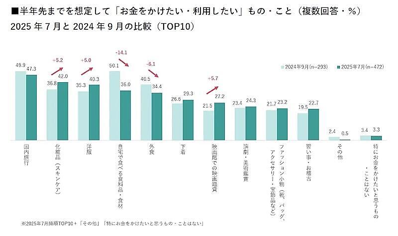 前回調査(2024年9月に実施)では1位が「自宅で食べる食料品・食材」だったが、今回の調査(2025年7月に実施)では14.1ポイント低下した。2位以下の項目では、前回調査と比べて「化粧品(スキンケア)」が5.2ポイント増、「洋服」が5.0ポイント増、「映画館での映画鑑賞」が5.7ポイント増えた。