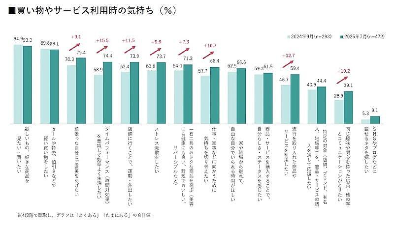 買い物やサービス利用時の気持ちを聞いたところ、上位は「欲しいもの、好きな商品を見たい・買いたい」が93.3%、「セールや特売、値引きなどで賢い買い物をしたい」が89.1%だった。前回調査と比較してほぼ横ばいになっている。