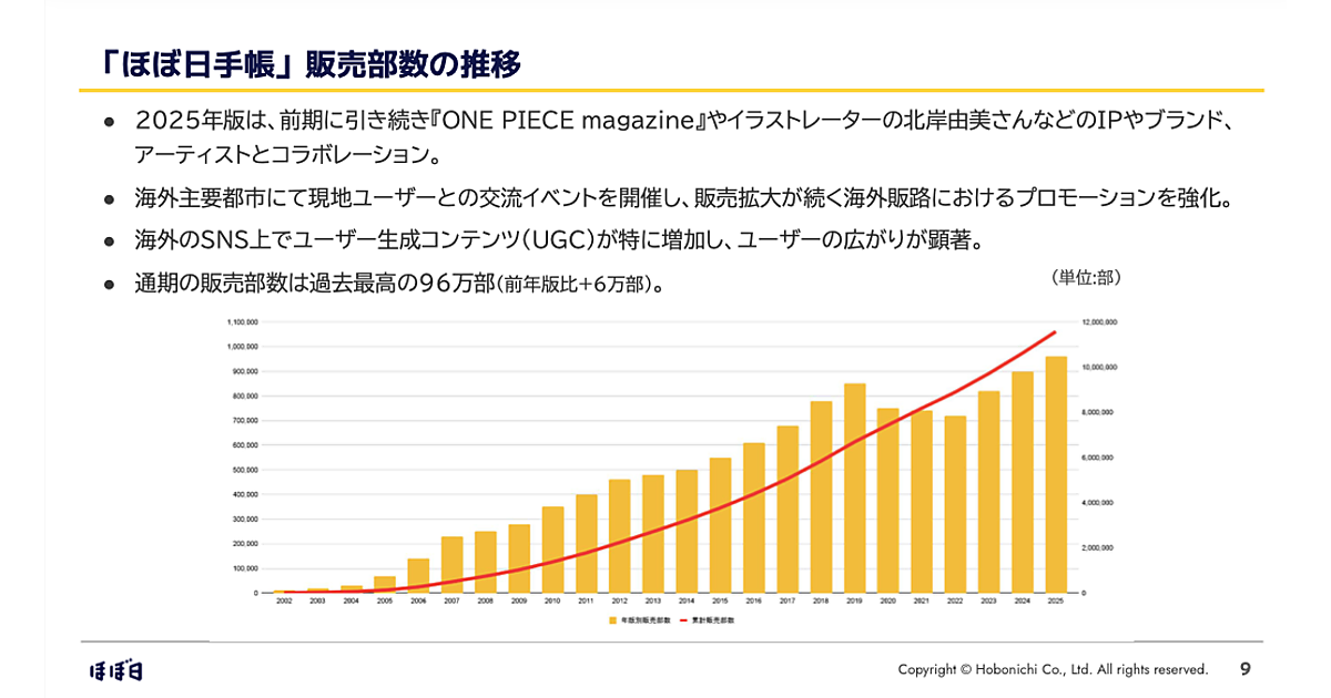 売り上げの内訳は「ほぼ日手帳」が前期比18.4%増の58億5000万円、「ほぼ日」商品が同9.9%増の22億8200万円、「その他」は同5.7%増の5億4500万円だった。「ほぼ日手帳 2025」の販売部数は、過去最高の96万部となり前年版比で6万部増えた。