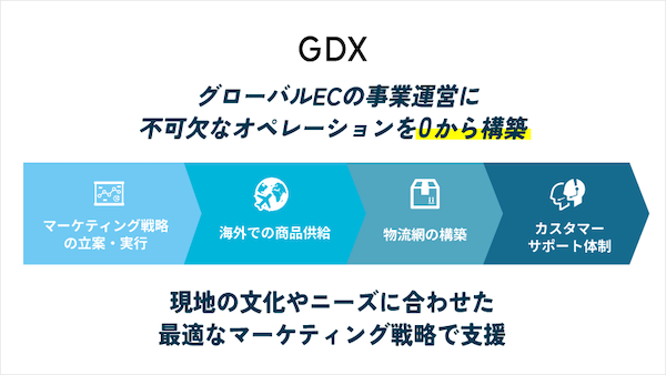 GDXと連携して支援する。現地の文化やニーズに合わせた最適なマーケティング戦略の立案から実行、海外での商品供給、物流網の構築、カスタマーサポート体制など、事業運営に不可欠なオペレーションをゼロから構築する。