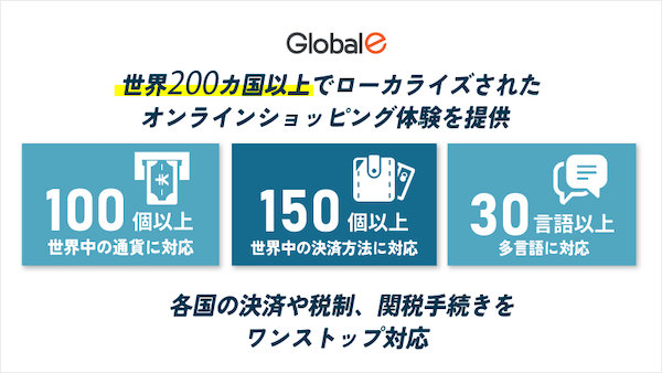 Global-eは世界200以上の国や地域の消費者へ、現地言語や現地通貨などでのサイト表示、現地言語による税金・関税対応・支払方法、配送、返品といったサービスをローカライズしたECプラットフォームとして提供している。