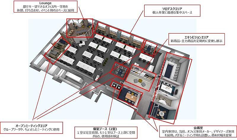 新オフィスは延床面積約580平方メートル(約175坪)で、旧オフィスから1.5倍に拡大した。座席は75~80席を配置、会議室は5室、ミーティングエリアは4区画。多様な働き方に対応可能なゾーニングや、コミュニケーションを促進する動線を設計している。