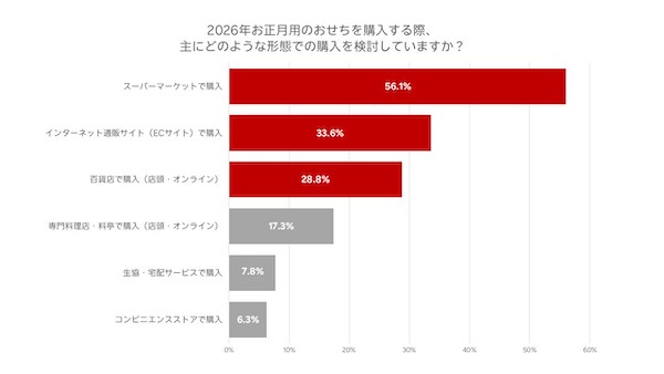おせちの購入先は「スーパーマーケット」(56.1%)が最も多く、次いで「インターネット通販サイト(ECサイト)」(33.6%)、「百貨店」(28.8%)。おせちはすべてを購入に頼るのではなく一部でも手作りしたいと考えていること、おせちには何かしら手作りの品目を取り入れたいと考えている。