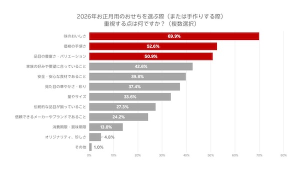 おせちを選ぶ際または手作りする際に重視する点のトップ3は、「味のおいしさ」が69.9%でトップ。「価格の手頃さ」(52.6%)、「品目の豊富さ・バリエーション」(50.9%)と続いた。