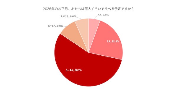 2026年のお正月におせちを食べる人数について聞いたところ、「3~4人」と回答した割外が56.1%と過半数を占めた。一方、「2人」と回答した割合は22.8%で、少人数世帯での喫食ニーズも一定数存在している。