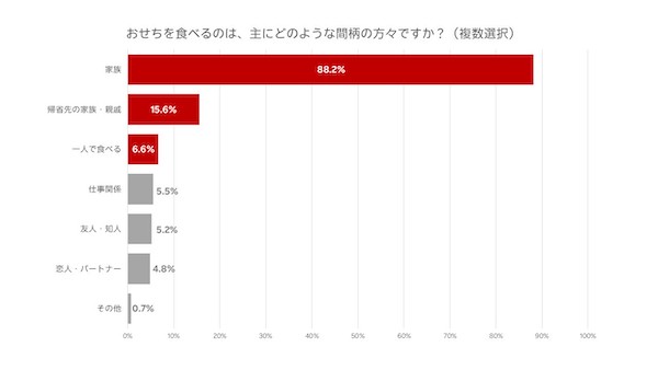 また、おせちは「家族」と一緒に食べると回答した割合は88.2%に達した。現在も年始の家族だんらんの中心にあることがわかった。