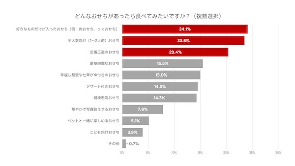 「どんなおせちがあったら食べてみたいか」という質問では、「好きなものだけが入ったおせち」が24.1%、「少人数向け(1~2人前)おせち」が23.5%。「定番王道おせち」も20.4%だった。個々の好みやライフスタイルに合わせたおせちへの潜在的なニーズが明らかになった。