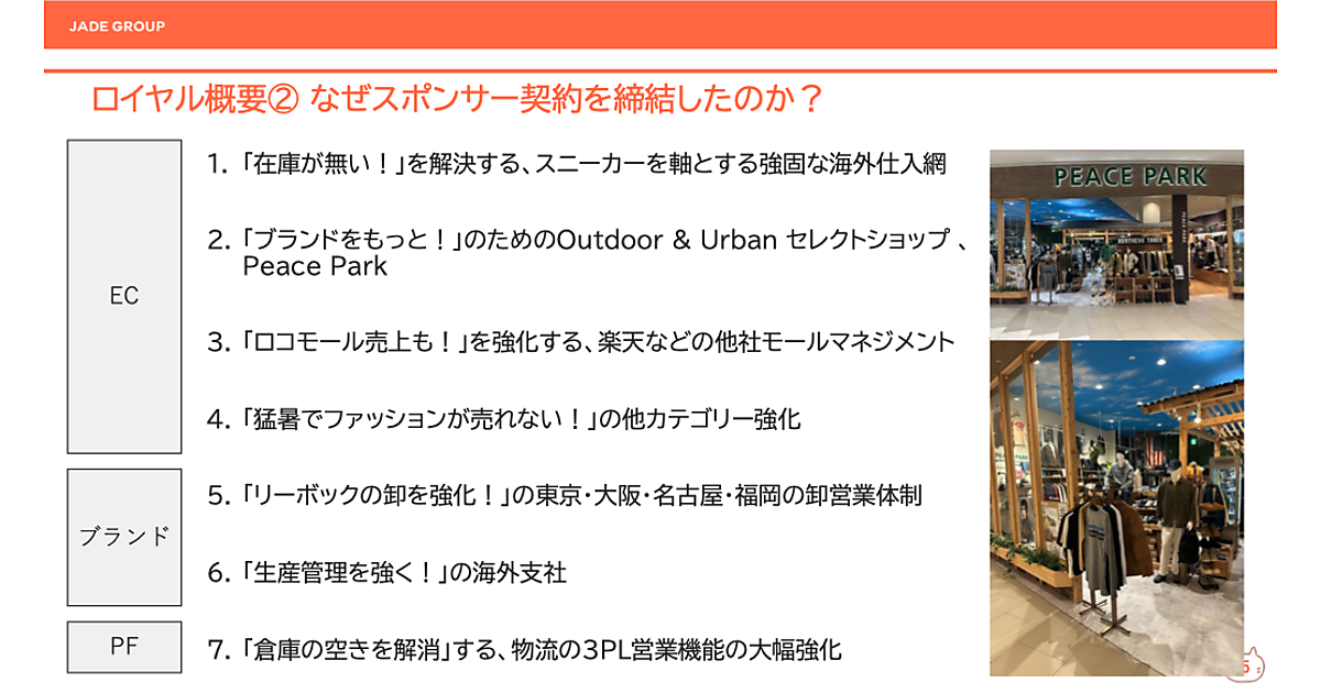ジェイドグループは、ロイヤルの仕入れルートや販売網の獲得がサービスの強化・拡充につながると判断。スポンサー契約の締結理由について次の7点をあげた。
