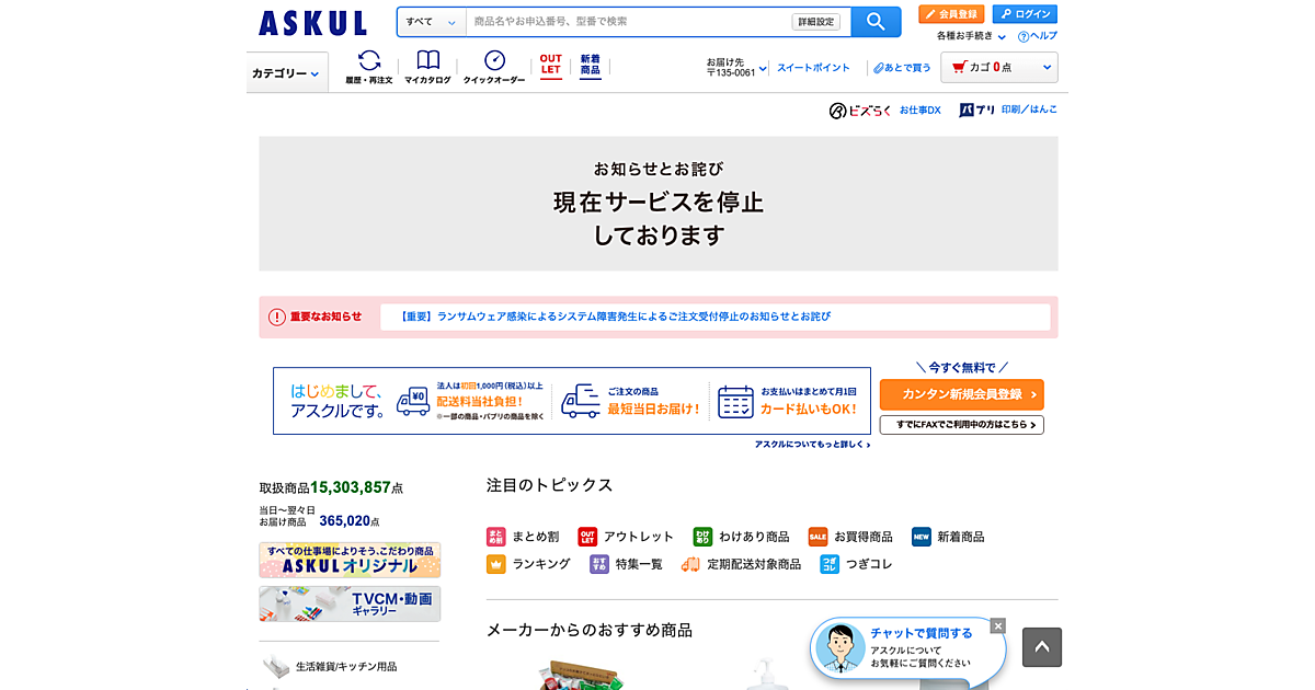 アスクルは10月19日、ランサムウェア感染によるシステム障害で、「ASKUL」「ソロエルアリーナ」「LOHACO」の受注・出荷業務を停止したと発表した。復旧のめどは立っていない模様。