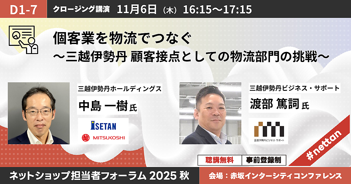 - 三越伊勢丹の「個客業」×物流戦略を大公開! 百貨店品質の顧客体験とフルフィルメントモデルが学べるリアルイベント【11/6+7開催】