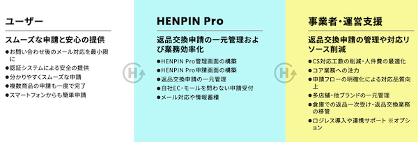 「HENPIN Pro」は、ECの返品交換申請を一元管理するシステム。ロジレスが提供するEC自動出荷システム「LOGILESS」と連携し、注文情報に基づいて返品・交換手続きを自動化する。