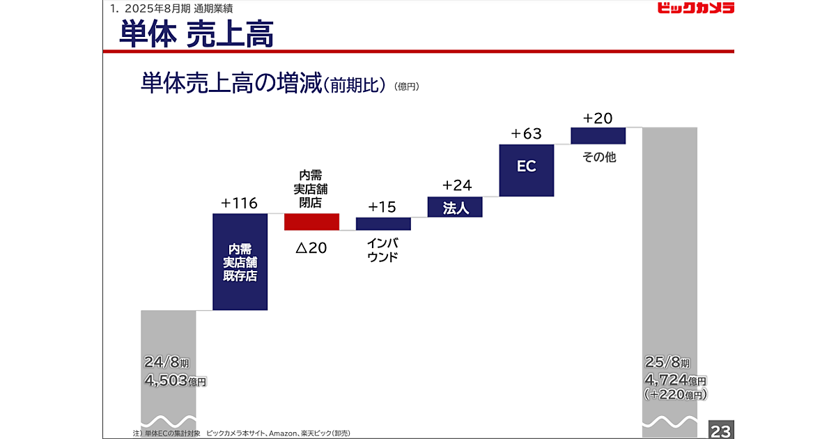 ビックカメラ全体の2025年8月期における単体売上高は前期比4.9%増の4722億2200万円だった。営業利益は45.8%増の94億7600万円、経常利益は27.6%増の146億3600万円、当期純利益は76.3%増の108億3000万円だった。ビックカメラ本サイト、Amazon、楽天ビック(卸売)のEC領域が前期比で63億円増となるなど増収に貢献した。