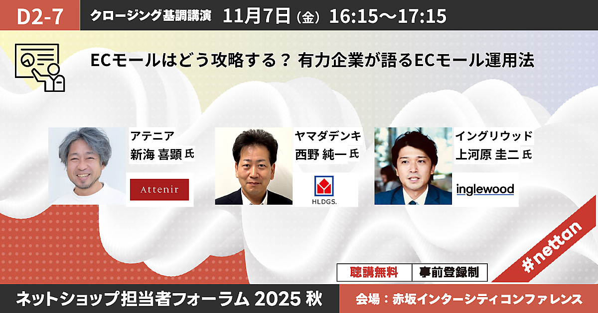 11月6日(木)+7日(金)に、大型オフラインECイベント「ネットショップ担当者フォーラム 2025 秋」を東京「赤坂インターシティコンファレンス」を開催。ビームス、アテニア、イングリウッド、中川政七商店、TSI、ミスミ、タカラトミー、三越伊勢丹など大手EC・通販実施企業が登壇、実践的事例や知見を学べるセッションを多数用意しています。全公演すべて無料で聴講できます!(事前登録制)。まだお申し込みをしていない方のために、編集部がおすすめ講演の見どころをご紹介します。
