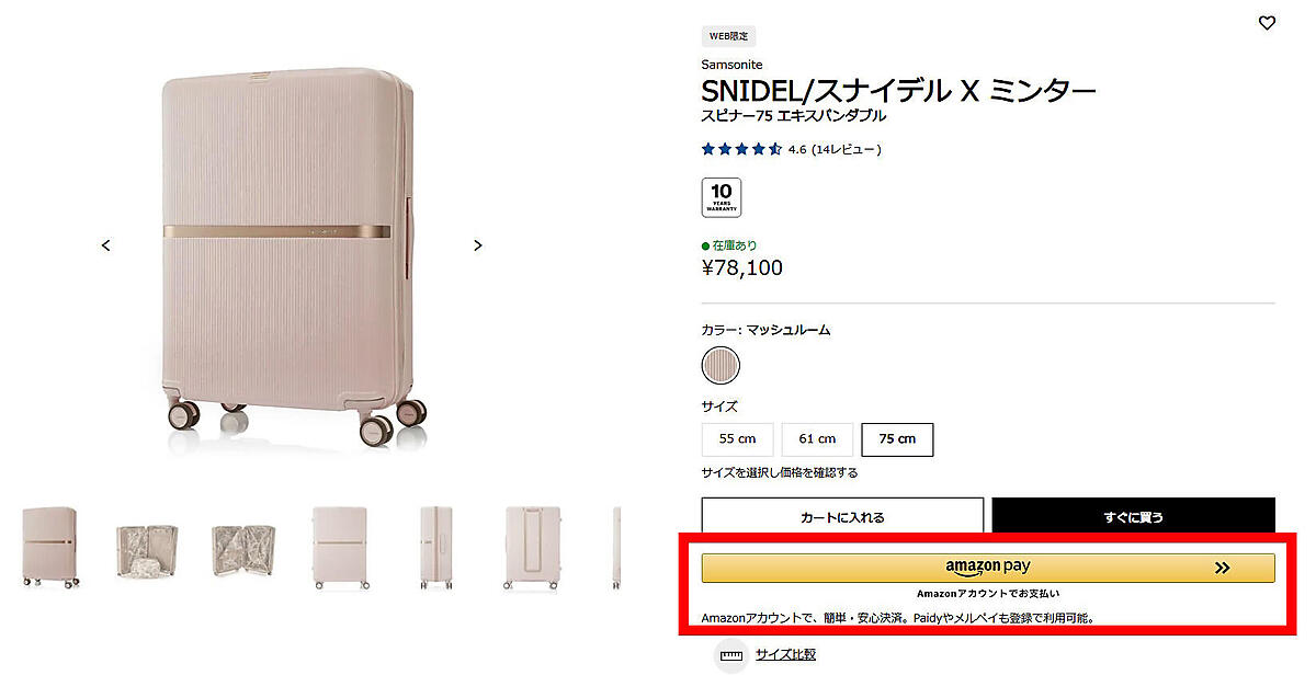 2018年の導入以降しばらくは、カートまで進んでから「Amazon Pay」のボタンが表示される仕組みだったが、2025年7月の決済機能リプレイス後は、「サムソナイト」「グレゴリー」の両サイトで、カートだけでなく商品詳細ページの時点でも「Amazon Pay」のボタンを表示するようにした。