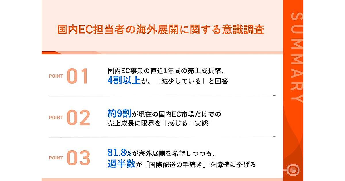 国内EC事業の直近1年間の売上成長率は4割以上が「減少している」と回答。約9割が現在の国内EC市場だけでの売上成長に限界を感じている。一方で、81.8%が海外展開を希望しつつも、過半数が「国際配送の手続き」を障壁にあげた。