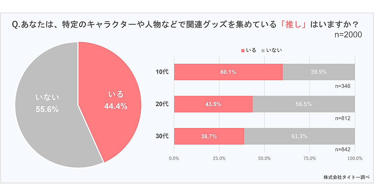 特定のキャラクターや人物などで関連グッズを集めている「推し」が「いる」割合は44.4%、「いない」が55.6%だった。世代別では「推し」がいる割合は10代で60.1%、20代で43.5%、30代で38.7%。年代が高くなるほど「推し」がいる割合は減少している。