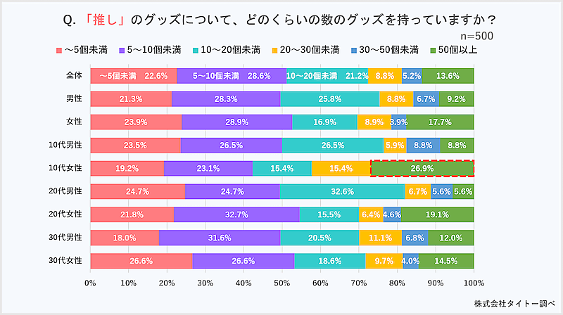 持っている「推し」のグッズ数は、全体で「5~10個未満」が28.6%で最多、「~5個未満」と合わせて51.2%が10個未満を所有している。男女・世代別では、10代女性が「50個以上」(26.9%)だった。