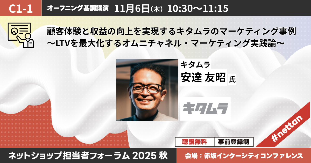 ネッタヌEC関与率60%のカメラのキタムラが、LTV(顧客生涯価値)を最大化させる実践的なマーケティング、オムニチャネルの実践例を解説します。「単なるポイント付与ではない、真の顧客接点とエンゲージメントを生むための設計思想」「顧客の行動データを活用し、効率的な集客とパーソナライズを実現する方法」「ECとリアル、新品と中古を結びつけ、顧客のライフサイクルに寄り添う戦略」などを説明。顧客を長期的にファン化させる「生きたマーケティングノウハウ」を求めているEC担当者にとって必聴のセッション。この機会に、国内トップクラスのオムニチャネル実践論を自社に持ち帰ってください。