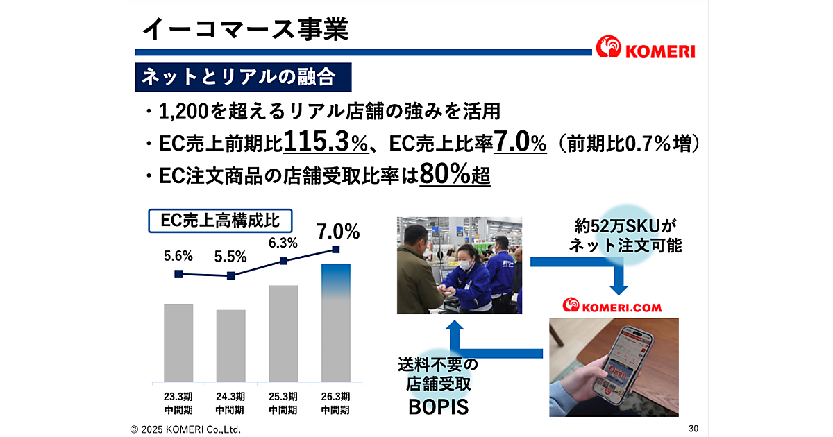 コメリのECは1200を超えるリアル店舗の強みを活用。約52万SKUがネットで注文可能で、送料不要の店舗受取「BOPIS」を推進している。EC注文商品の店舗受取比率は80%を超える。