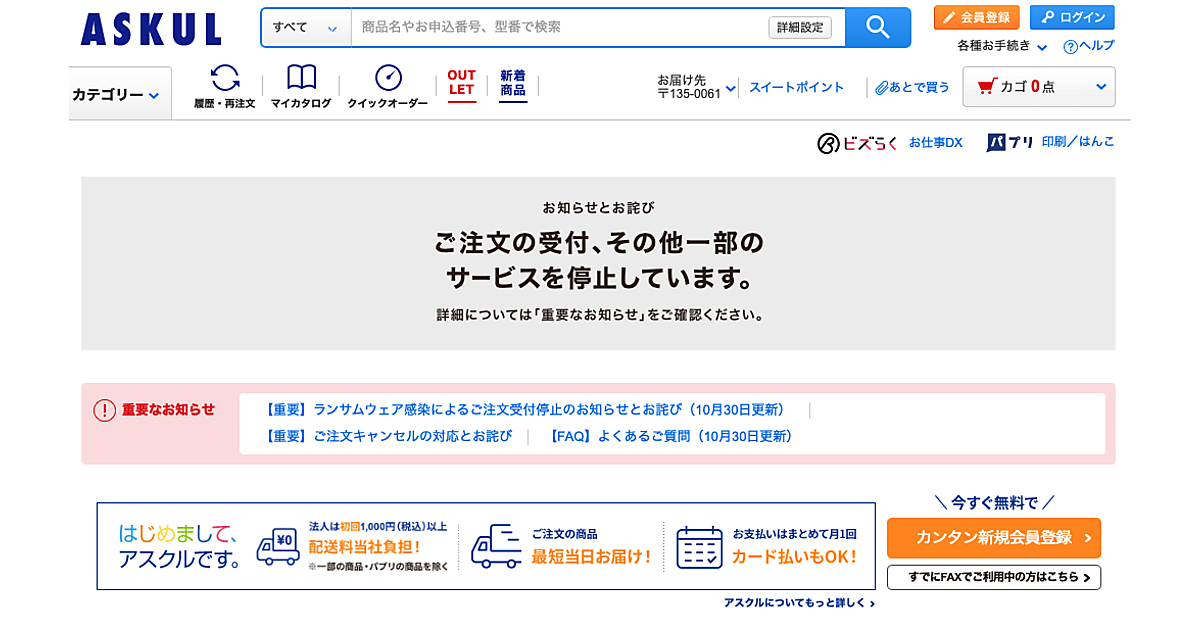 アスクルでは10月19日の午前に外部からの不正アクセスによる異常を検知し、ランサムウェア感染の疑いのあるシステムの切り離しとネットワーク遮断を実施。同16時30分に「ASKUL」「ソロエルアリーナ」「LOHACO」の受注を停止している。障害発生の範囲は、主に物流システム(WMS)で障害の発生を確認しているという。