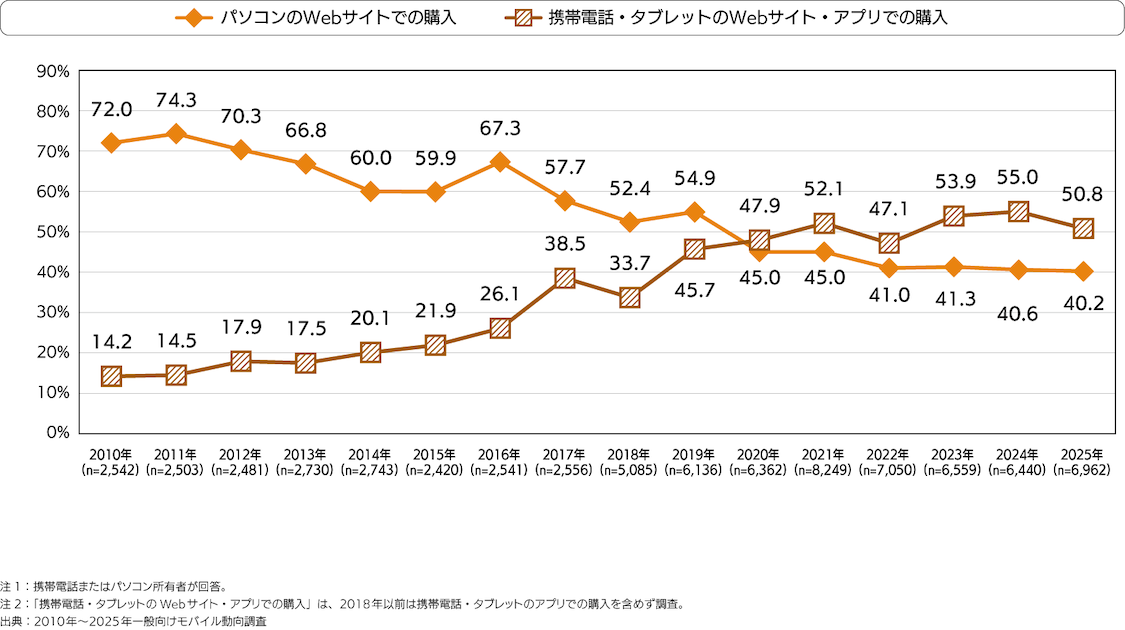 ネットショッピングやオークション利用率の年次推移について、「携帯電話・タブレットのWebサイト・アプリでの購入」が前年調査比4.2ポイント減の50.8%。「パソコンのWebサイトでの購入」は同0.4ポイント減の40.2%だった。2020年の調査で携帯電話・タブレットがパソコンを上回り、以降はいずれも横ばいが続いている。