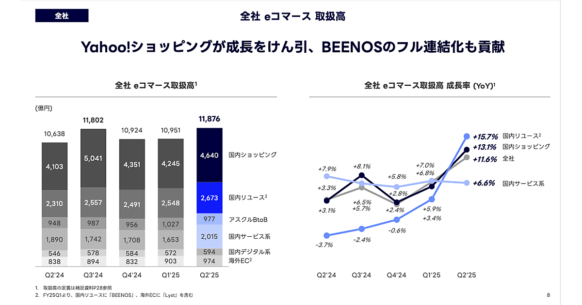 「Yahoo!ショッピング」でふるさと納税の駆け込み需要などが発生し約19%の成長となり、国内ショッピングの2025年7-9月期(純第4四半期)取扱高は前年同期間比で13.1%増の4640億円を記録。リユースでは、「Yahoo!オークション」が鈍化するも、「Yahoo!フリマ」が成長したことやBEENOSのフル連結化も貢献し同15.7%増の2673億円となった。