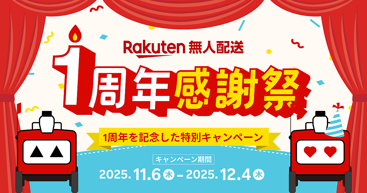 楽天は「楽天無人配送」1周年を記念し、11月6日から12月4日まで「1周年感謝祭」を実施。期間中に利用できる合計2000円分の3種類の割引クーポン配布や、注文者の中から抽選で「注文金額全額を楽天ポイントで還元」するキャンペーンなどの特典を用意している。