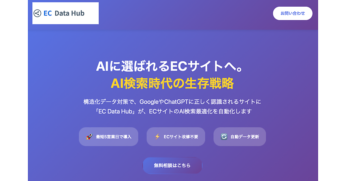 ECデータハブ」は、Schema.org(検索エンジンに自社サイトの情報をより詳しく伝えるためのマークアップ)準拠の構造化データを自動生成し、「ChatGPT Search」「Google AI Overview」などのAI検索エンジンに「理解・推奨」されるECサイトへの変革を支援するクラウドサービス。商品情報・在庫・価格・レビューなどのデータをJSON-LD形式に自動変換し、Googleタグマネージャー経由で配信することで、既存ECサイトのソースコード改修は不要としている。