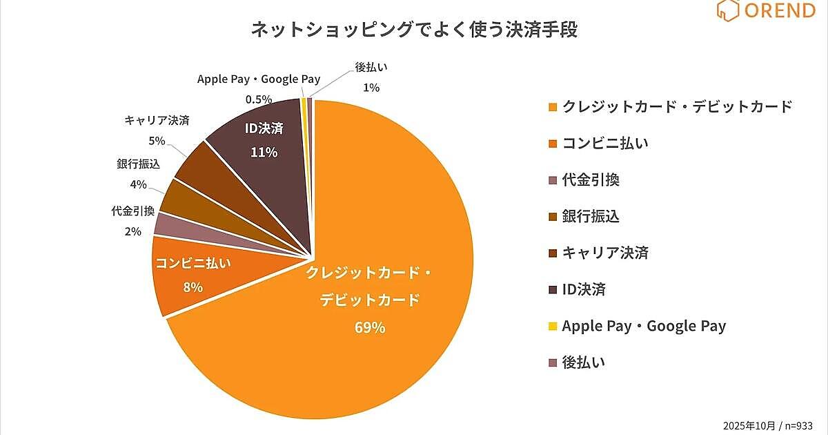 ネットショッピングでよく使う決済手段(支払い方法)について聞いたところ、最も多かったのは「クレジットカード・デビットカード」で69%、続いて「ID決済」が11%、「コンビニ支払い」が8%だった。クレジットカードが主流でありつつも、ID決済などの新しいキャッシュレス手段が補完的に使われている。
