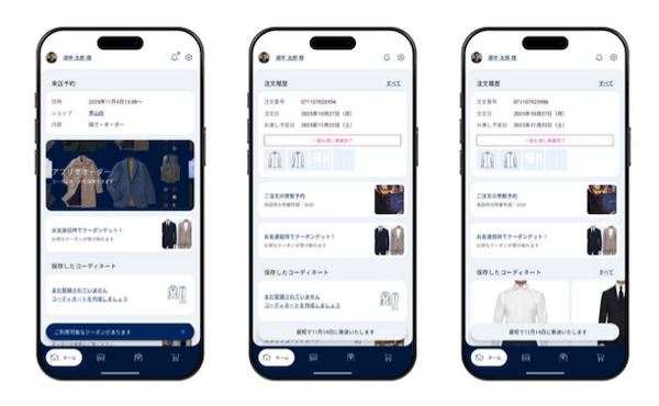 利用状況に応じてトップページが自動的に変化し、来店予約の状況、注文商品の進捗、納品予定日、登録した生地やディテール情報などをファーストビューで確認可能に。