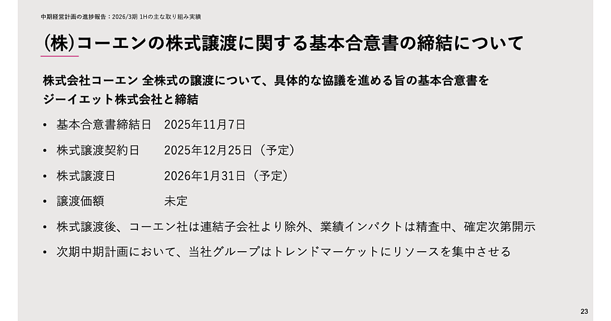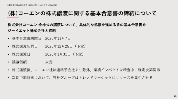 現在、諸条件について協議を進めており、株式譲渡契約の締結日は12月25日、譲渡実行日は2026年1月31日を予定している。譲渡価額は未定。