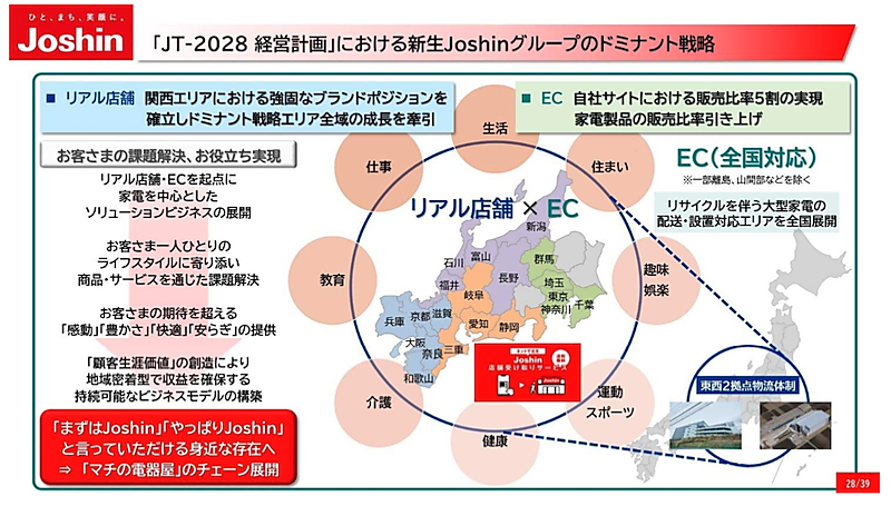 リアル店舗やEC、サービスインフラといった多様なタッチポイントを軸に、地域社会の暮らしに深く寄り添い、顧客1人ひとりのライフステージに応じた課題を解決。地域ベースの「Joshin経済圏」の構築を通じて、「ライフスタイル・サポートカンパニーへの進化」をめざすとしている。