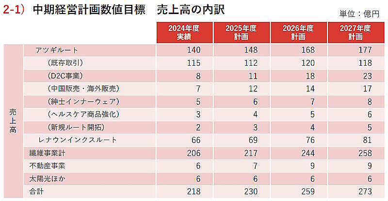 2028年3月期を最終年度とした中期経営計画では、2028年3月期の繊維事業の売上高は258億円を計画している。