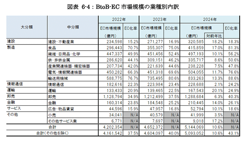 市場規模は2023年の約465.2兆円から2024年には約514.4兆円へと拡大し、EC化率も40.0%から43.1%へ伸長しました。前年比で10%以上の成長率を示す業種も複数あり、デジタル取引の浸透は加速しています。