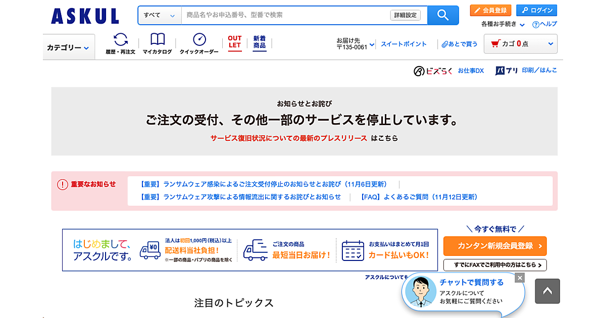 アスクルは10月19日にランサムウェア攻撃によるシステム障害を確認し、第1報を発表。以降、「ASKUL」「ソロエルアリーナ」「LOHACO」での受注を停止していた。