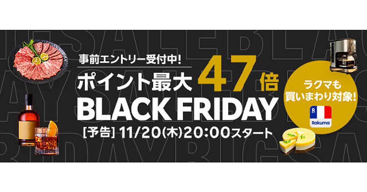 「楽天市場」では、「楽天市場のブラックフライデー ポイント最大47倍!」を実施。期間中、買い物をした店舗数に応じて、最大で通常の47倍となる「楽天ポイント」を進呈する。