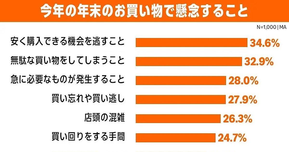 2025年の年末の買い物で懸念していることを聞いたところ、最多は「安く購入できる機会を逃すこと」で34.6%、続いて「無駄な買い物をしてしまうこと」が32.9%、「急に必要なものが発生すること」が28.0%だった。