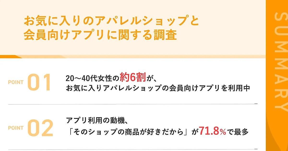 メグリが実施した「お気に入りのアパレルショップと会員向けアプリに関する調査」によると、気に入っているショップのアプリを現在利用している割合は58.9%だった。アプリに期待することは、「誕生日などにクーポンがもらえる」「セール情報を早く教えてくれる」「コーディネートの参考になる提案」といった声があがった。