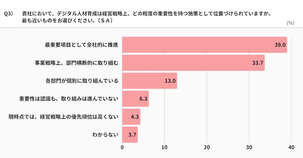 デジタル人材育成は経営戦略上、どの程度の重要性を持つ施策として位置付けられているかを聞いたところ、「最重要項目として全社的に推進」が39.0%、「事業戦略上、部門横断的に取り組む」が33.7%で、全体の約7割が「デジタル人材育成が経営・事業戦略上重要である」と回答している。