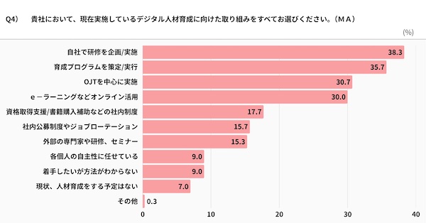 現在実施しているデジタル人材育成に向けた取り組みは、「自社で研修を企画・実施」が最多の38.3%、続いて「育成プログラムを策定・実行」が35.7%、「OJTを中心に実施」が30.7%、「eラーニングなどオンライン活用」が30%だった。