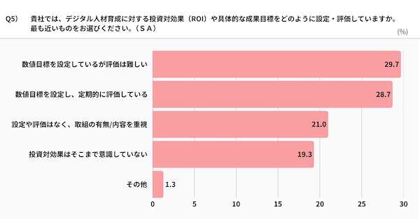 「数値目標は設定しているが評価は難しい」が29.7%、「設定や評価はなく、取組の有無/内容を重視」が21.0%、「投資対効果はそこまで意識していない」が19.3%で約7割の企業でデジタル人材育成に対する費用対効果が可視化されていないことがわかった。