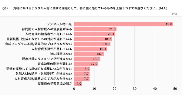 デジタル人材に関する課題として特に強く感じるものは、「人材不足」が最も多い49.0%、続いて「部門間で人材育成の温度感に差がある」が21.0%、「人材育成担当者の不足」が20.3%、「最新技術(生成AI)への対応が遅れている」が18.7%だった。