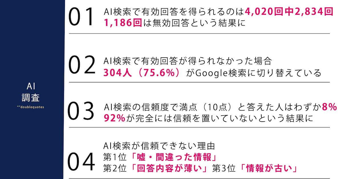 アウトオブザボックスが実施したAI検索に関する調査によると、AI検索で有効回答が得られなかった場合、75.6%が「Google検索に切り替える」と回答した。また、AI検索の回答結果の満足度が低い場合の情報の補填は「企業の公式ホームページを見る」「サービスや商品のホームページを見る」などが上位にあがった。