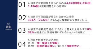 有効回答を得られなかったと答えた回答者に理由を聞いたところ、「観光地について質問したところ、実際には存在しない観光地の名前と解説が含まれた回答が返ってきた」「『海外留学おすすめ』でAI検索したらその国の名産や観光地を紹介された」「手軽に作れる時短レシピを10個教えてと質問したら、5個しか送られてこなかった」といったコメントがあがった。