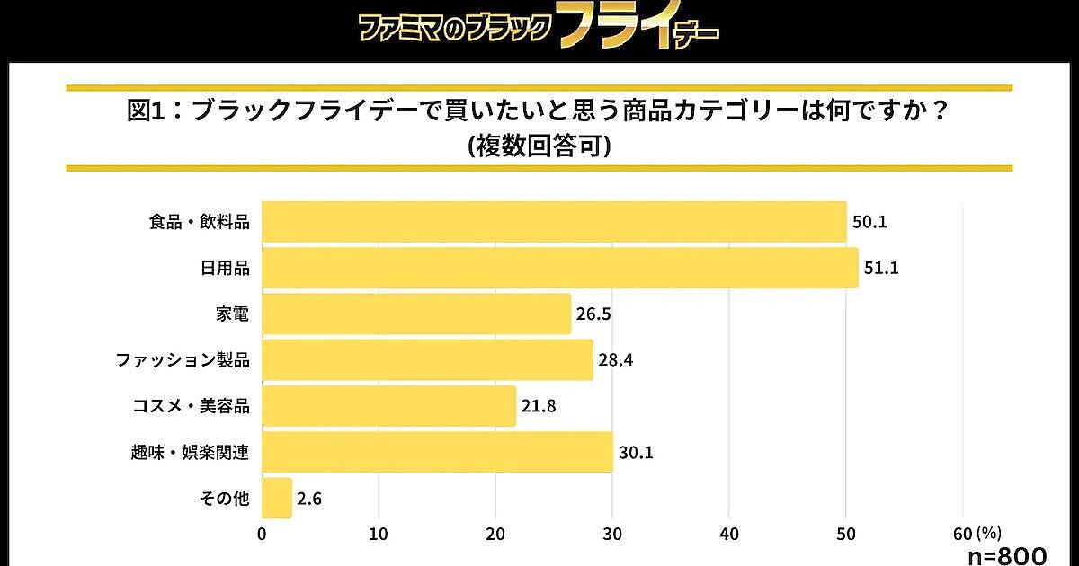ファミリーマートが実施した「ブラックフライデーの買い物に関するアンケート」によると、買いたい物は「日用品」「食品・飲料品」が上位を占めた。ブラックフライデーのセールで期待することは「日常的に使う商品の割引」がトップだった。