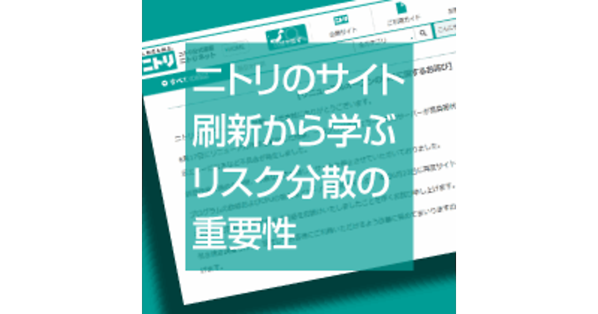 ニトリが行ったサイトリニューアルの失敗は、6月17日~6月23日午後6時までの実質7日間、通販・EC売り上げの大半を占める「ニトリネット」の営業停止という事態を招きました。ただ、ニトリは「楽天市場」「Yahoo!ショッピング」にも出店しており、サイト訪問者をモール店へと誘導。全通販・ECの営業ストップという最悪の事態は避けることができました。今回はニトリの失敗事例から、“EC”の観点で機会損失を最小限に抑える「リスクヘッジ」の方法についてまとめてみます。