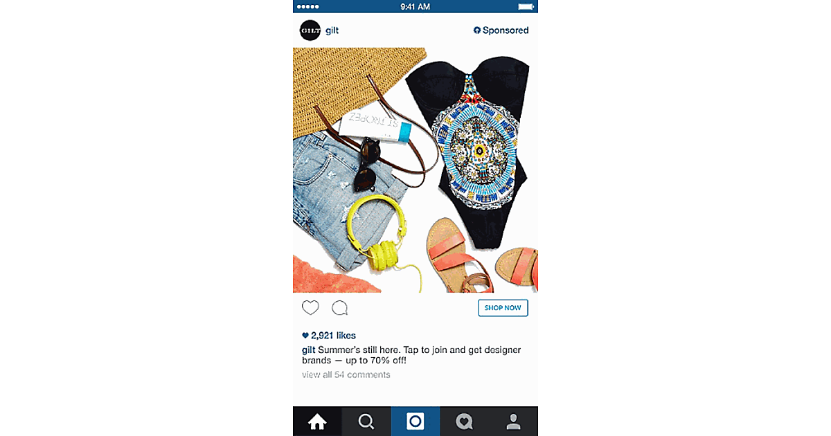さらに、広告の写真の中に商品購入や会員登録、アプリのダウンロードなどを促す「ボタン」を設置し、広告主のサイト内の商品購入ページやアプリのインストールページなどに誘導できる「ダイレクトレスポンス型広告」(画像は米国の事例=米ギルトグループの「ダイレクトレスポンス型広告」)や複数の写真広告をスライドショー式で表示し、2枚目以降の写真に“商品購入”などを促す「ボタン」を付けて広告主のサイトに誘導する「カルーセル広告」を開始した。